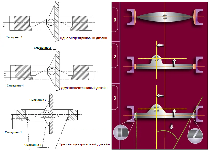 - с тройным смещением (эксцентриком) – имеет три смещения в разных плоскостях диска, установленного эксцентрично относительно оси. Это помогает обеспечить более надежное уплотнение. В этом типе затвора сочетается конструкции двойного смещения и дополнительного смещения оси дисковой манжеты.